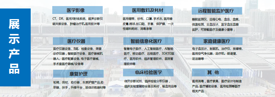 內(nèi)容全面涵蓋了包括醫(yī)用電子、醫(yī)學(xué)影像設(shè)備、智能醫(yī)療、病房護(hù)理及輔助設(shè)備、醫(yī)用敷料、體外診斷試劑、光學(xué)急救、康復(fù)護(hù)理以及醫(yī)療信息化等。