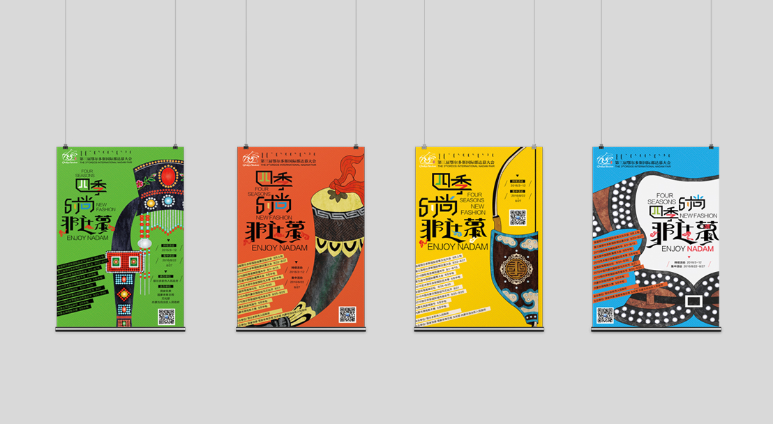 第三屆鄂爾多斯國(guó)際那達(dá)慕大會(huì)暨首屆鄂爾多斯國(guó)際創(chuàng)意文化大會(huì)宣傳系統(tǒng)設(shè)計(jì),那達(dá)慕大會(huì)方面以扁平化風(fēng)格的頭戴、號(hào)角、弓箭、搏克服為主視覺,用蒙文拼成那達(dá)慕字樣,襯以干凈明快的綠、紅、黃、藍(lán)四種純色,在這基礎(chǔ)上設(shè)計(jì)制作海報(bào)、路旗、燈桿旗、展架、大型廣告、環(huán)柱廣告、吊旗、導(dǎo)視系統(tǒng)、高垂廣告、橫幅、場(chǎng)館出入口廣告等。
